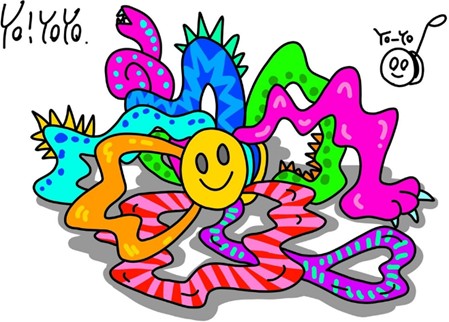 藝術家阿部有加ABEYUKA.,將美國的街頭塗鴉文化元素結合溜溜球創作《Yo! YoYo》,「Yo-Yo」是溜溜球,也是「You’re On Your Own」的縮寫,意思是:你得自己試一試!生活有時候就像溜溜球的線——一不小心就打結啦!但沒關係,這就是冒險的一部分。你會慢慢找到方法,一邊解開它,一邊享受這趟特別的旅程!