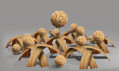 藤球(Sepak Takraw)是一項結合足球、排球及武術技巧的極限運動,深受東南亞各國喜愛。選手以頭、肩、胸及腳等部位靈活控球,展示出驚人的彈跳力與空中技術,讓比賽過程充滿挑戰與驚奇。藝術家峇岦嵐偲・旮札涅灆,將藤球的編織紋理放大,轉化為整體結構的造型設計,勾勒出如同藤球在空中躍動的流動線條。