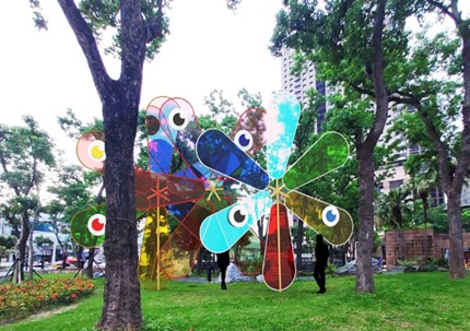 風車是台灣經典的童玩之一,藝術家鄭元東以放大的比例與繽紛的色彩,創作出充滿穿透感與童趣的大型風車裝置。透明材質讓陽光自由穿梭,折射出的光影灑落四周,隨風車轉動,幻化出一幕幕充滿想像的詩意畫面,喚起人們對風車的全新記憶。